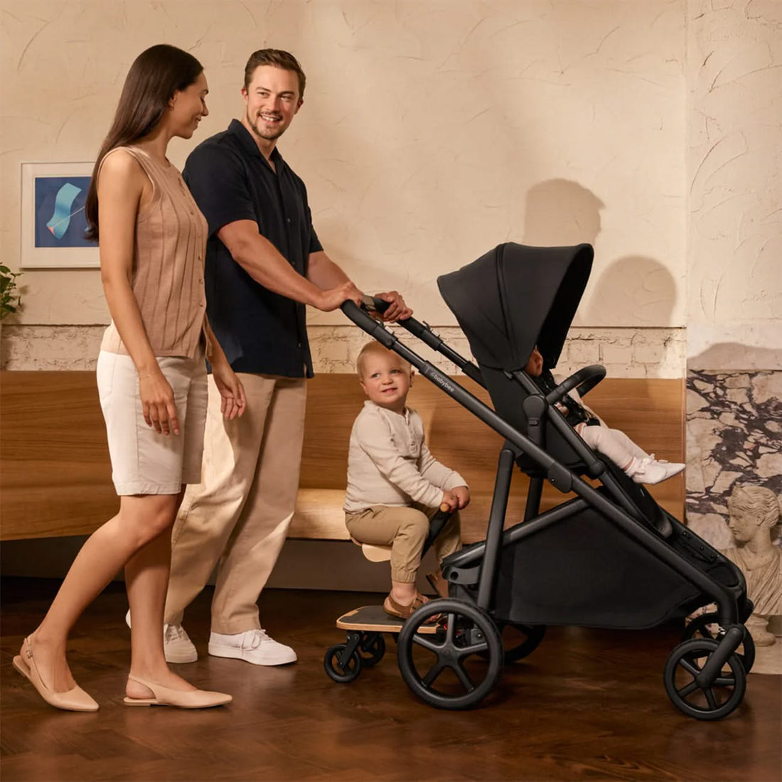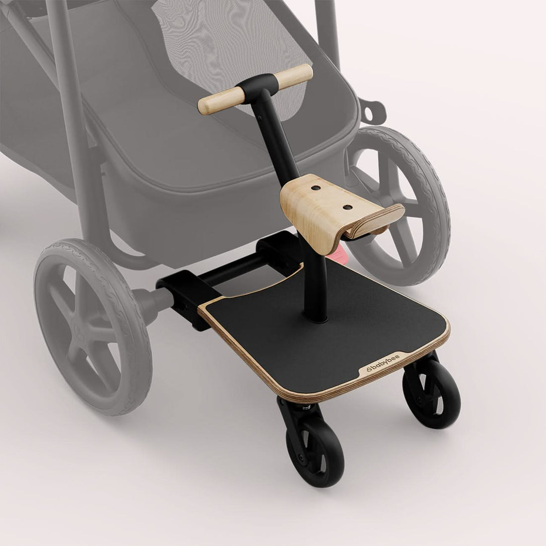 A versatile ride-on board with a seat, designed to keep your toddler close while your baby rides in the pram.
