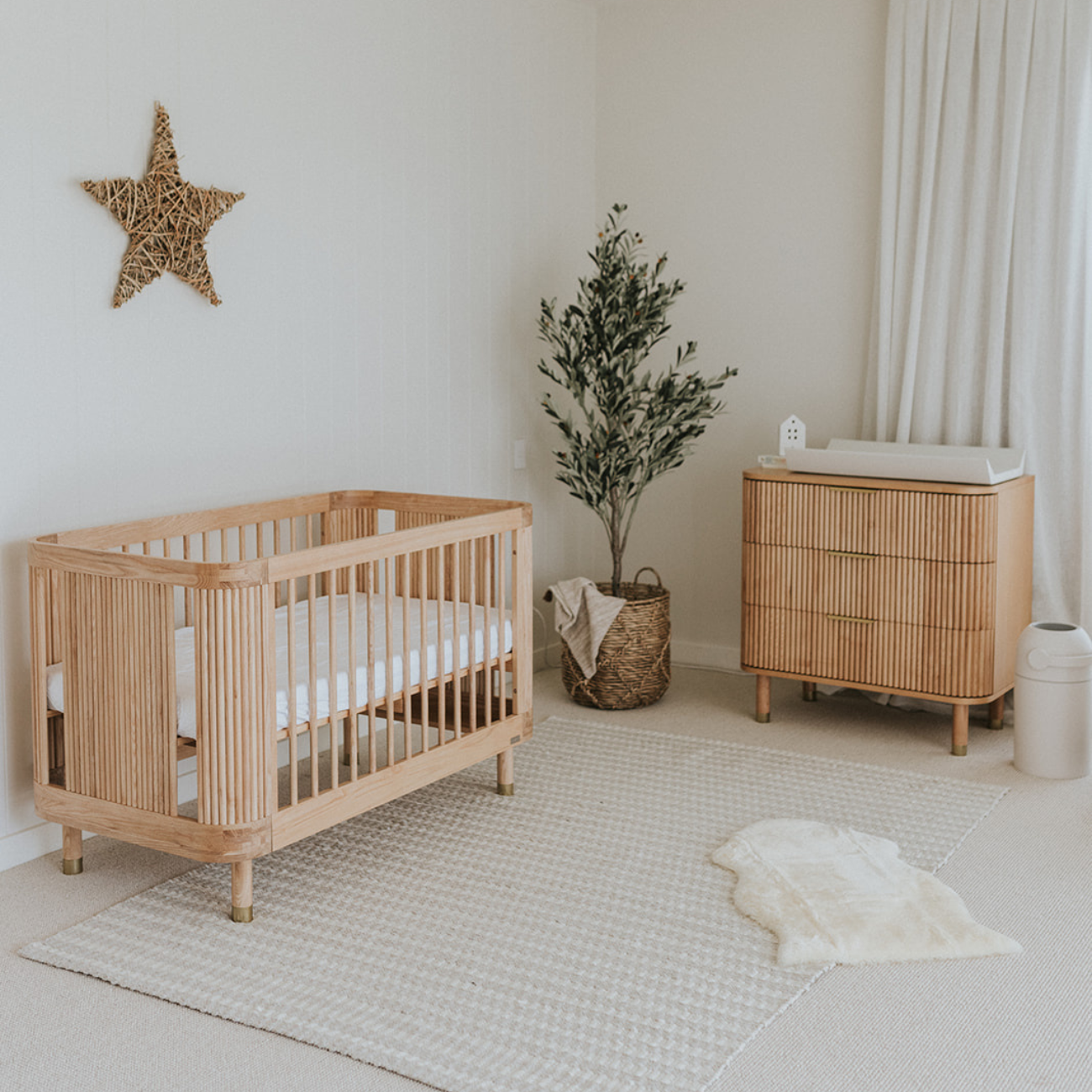 A cot that’s built to last, and designed to grow. The BabyRest Juno Cot is crafted from sustainably sourced timber with a soft ash finish that brings a calming, minimalist feel to the nursery. Its clever design includes two mattress height positions and the option to convert into a toddler bed, supporting your baby from day one right through to the toddler years. Smooth lines and a timeless silhouette mean it works beautifully in any space, while meeting Australian safety standards for extra peace of mind. It’s one of those pieces you’ll be grateful you chose — sturdy, stylish, and made to go the distance.