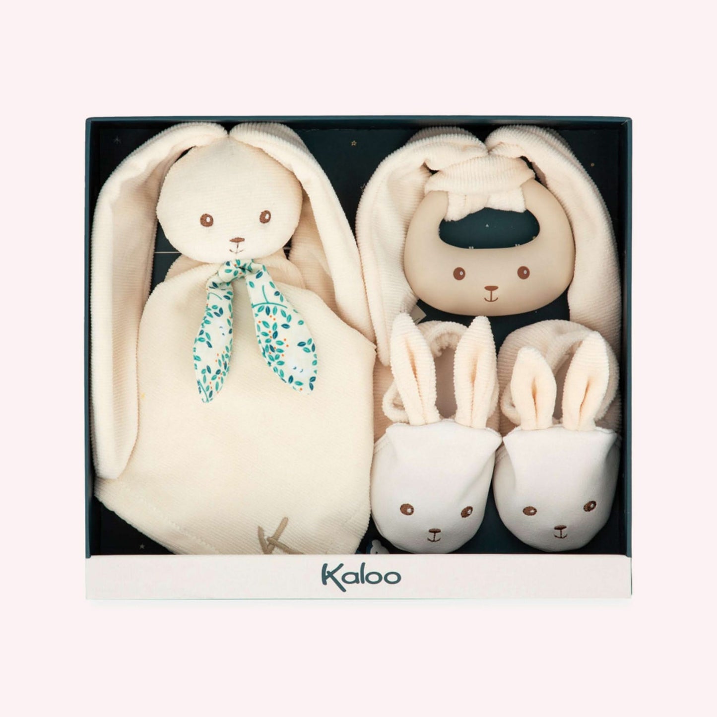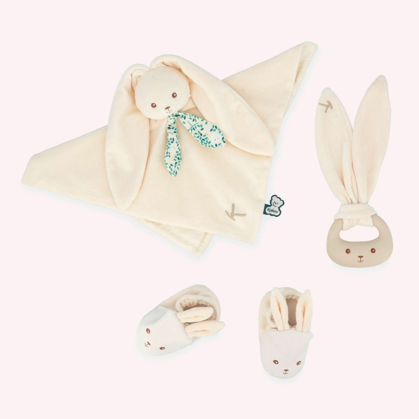 This set of 3 essentials is the perfect gift for new babies. It includes a comforter, a teether and cream slippers. The comforter is a cheerful rabbit, baby's first companion throughout the day and night. Made from two materials, corduroy and a light viscose fabric, it's soft and sensory. The rabbit comforter features long, cuddly ears. Thanks to them, you can hang it up anywhere and never lose it. As well as wrapping baby in tender hugs, they're easy for little hands to grab. The silicone teether is ideal for relieving teething problems. Its soft, rounded shape makes it ideal for little mouths with two textures. The front is smooth, while the back has spikes to help the first teeth come through and massage sore gums. The large, soft ears are easy to grasp and can be hung. What's more, the ears are detachable for easy washing. The slippers can be used from 0 to 6 months and match the comforter and teether to keep your baby warm. Made from two materials, corduroy and suede, they're soft and cute on baby's feet, with little bunny ears. This set comes in a pretty box that can be personalised with a message in the space under the lid.