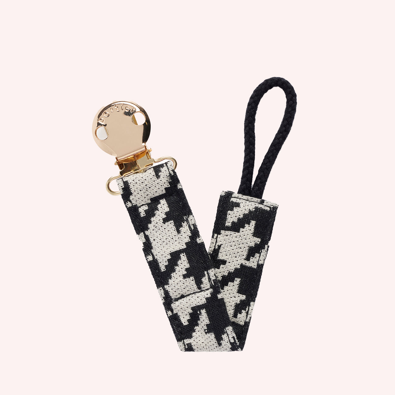 Loop the cotton strap through your baby’s pacifier, then attach the clip securely to their clothing, carrier or pram.