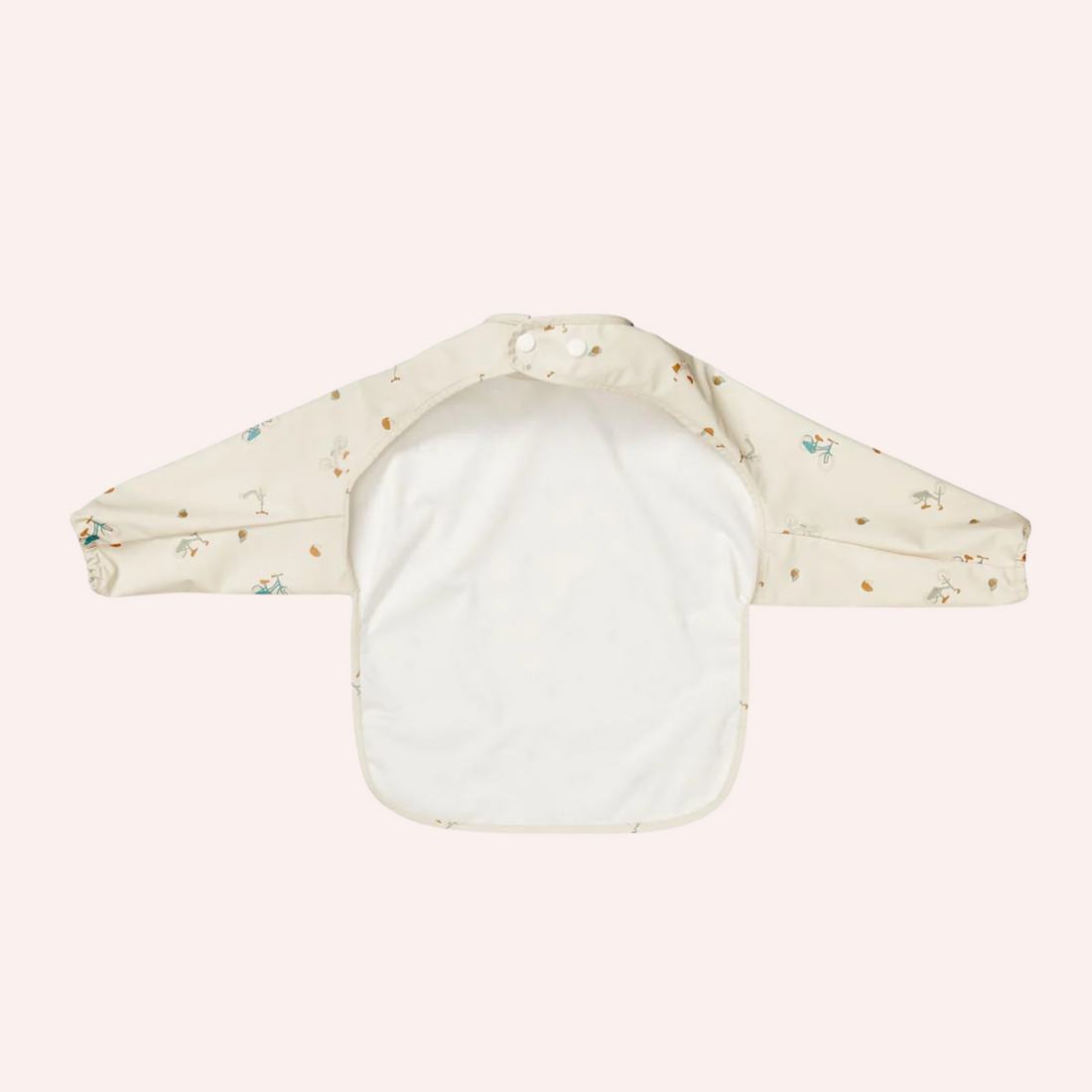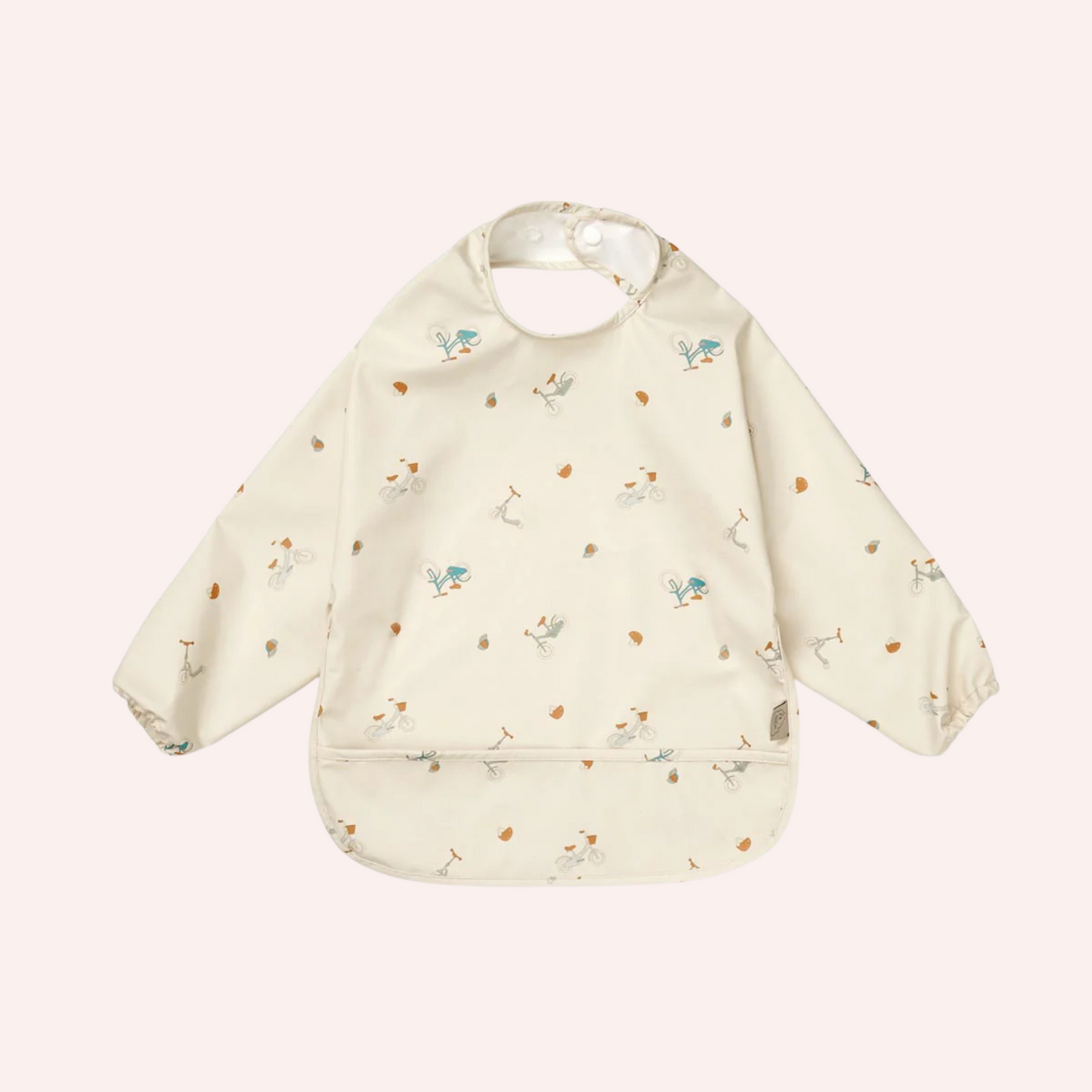 A waterproof sleeved bib that keeps little ones clean during meals and messy play.
