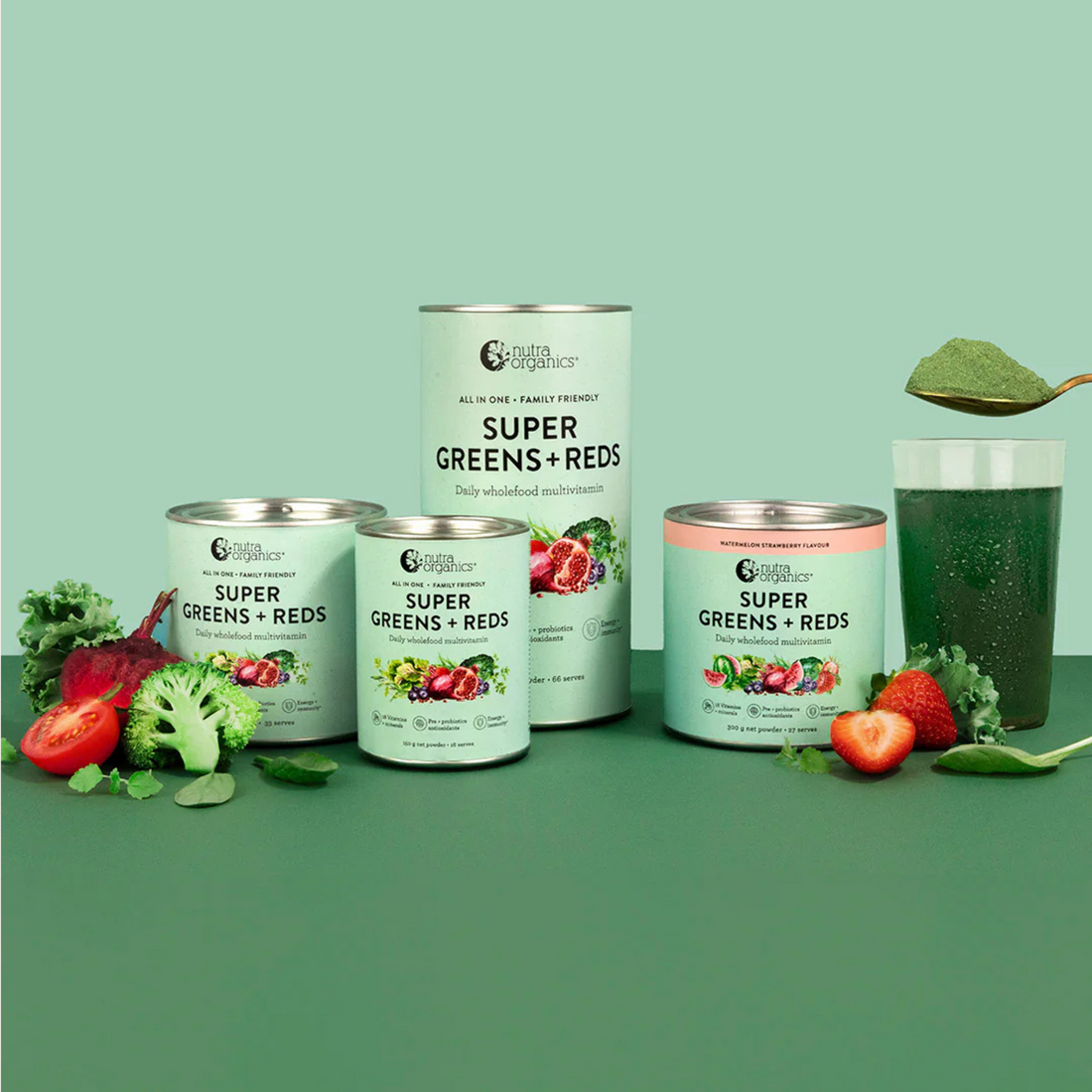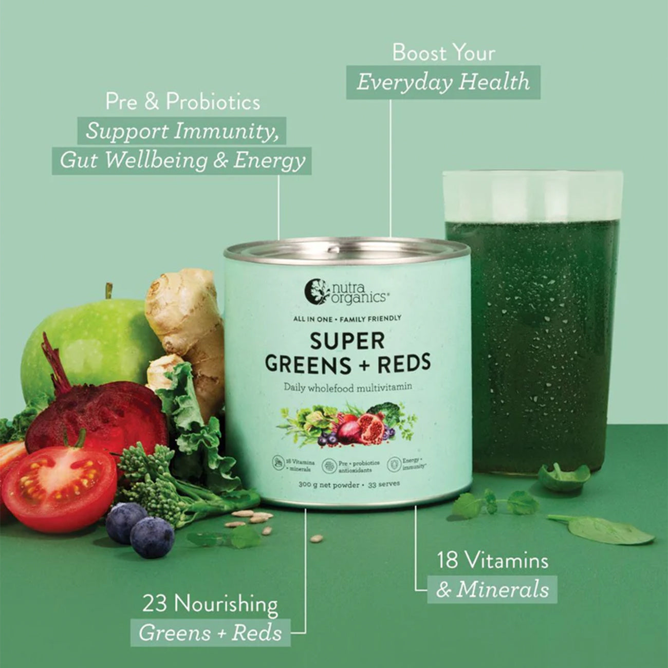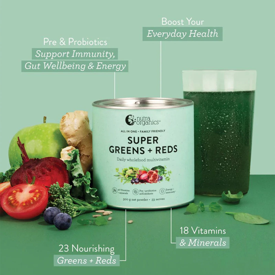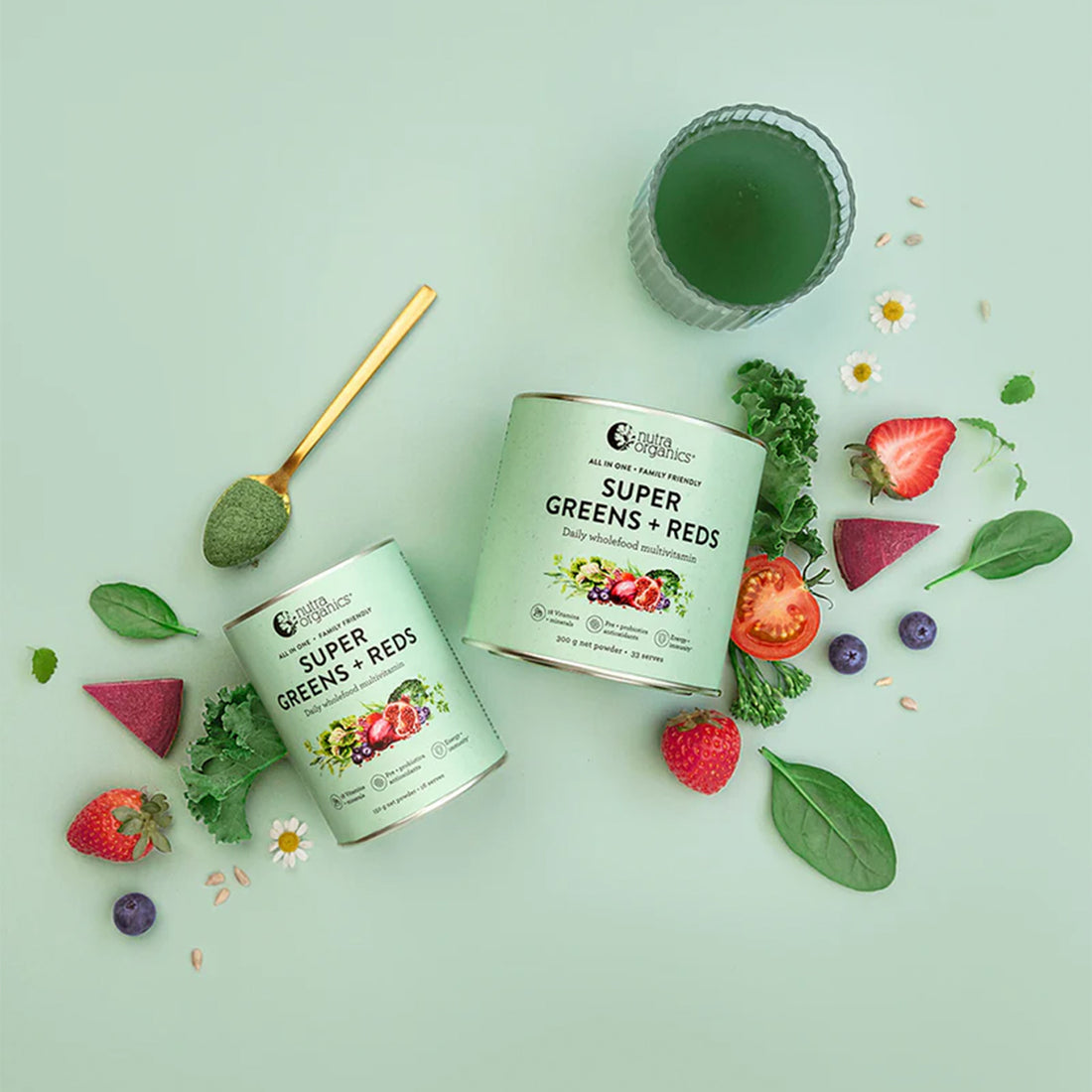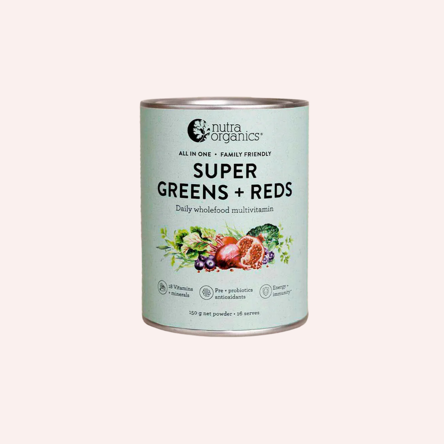 Nutra Organics' Super Greens + Reds is a comprehensive daily supplement made from natural wholefood sources. It delivers 18 essential vitamins and minerals, including vitamins A, C, D, E, K, B-complex, calcium, iron, magnesium, and zinc. Enhanced with a synbiotic blend of prebiotics and probiotics, plant-based protein, and restorative botanicals, this powder supports overall wellbeing. Free from synthetic ingredients, it's suitable for the whole family, including pregnant and breastfeeding women, and children from 12 months old.