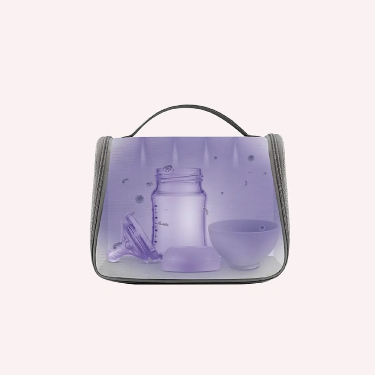 Hospital level sterilisation for your bottles, dummies and breast pump parts in one compact travel carry case.